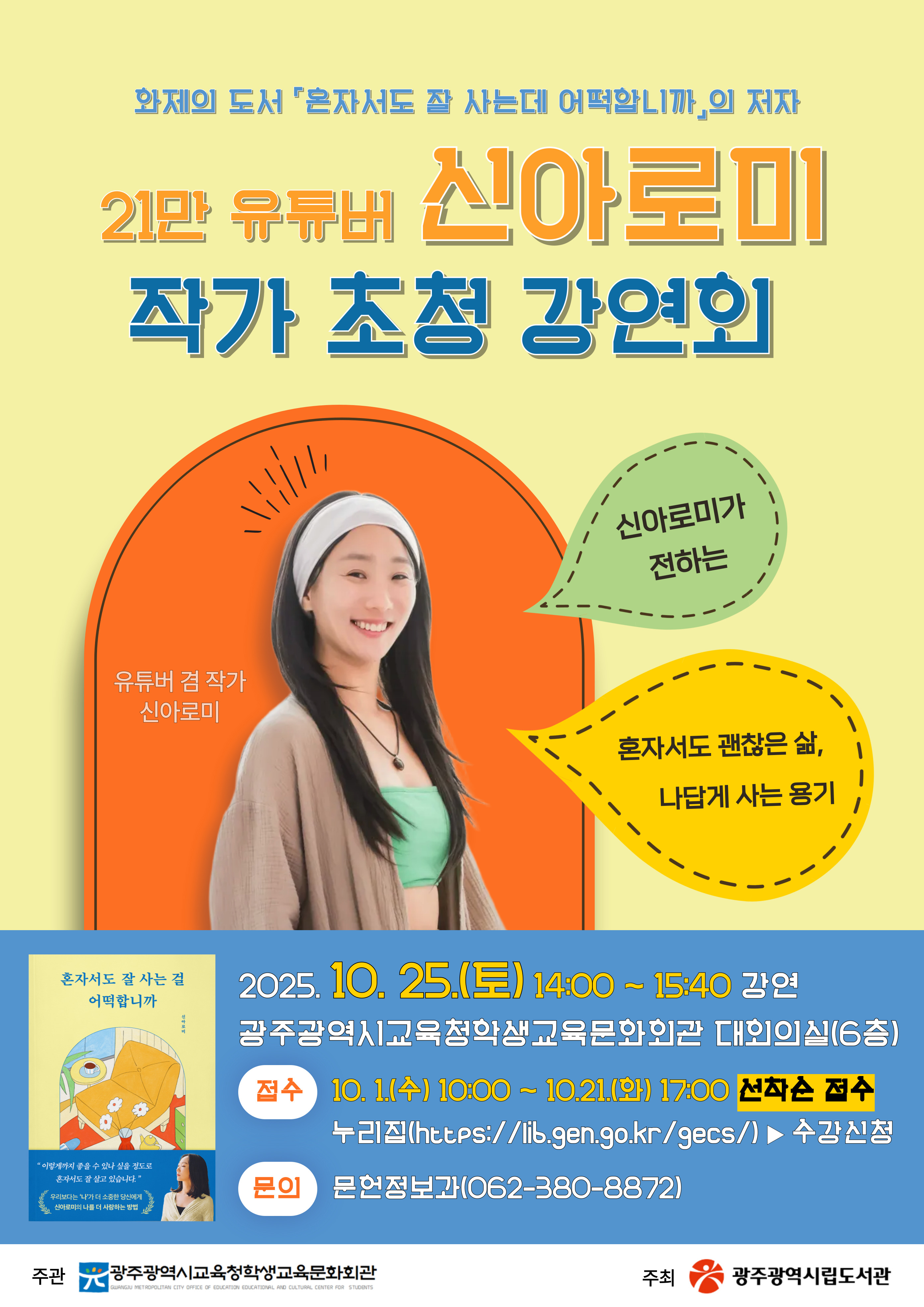 「혼자서도 잘 사는 걸 어떡합니까」의 저자, 인기 유튜버 신아로미 작가 초청 강연회를 운영합니다. - 강연일시: 2025. 10. 25.(토) 14:00 ~ 15:40 - 강연장소: 회관 대회의실(6층) - 모집대상: 시민 70명 - 신청방법: 홈페이지 로그인 후 참석자 본인 명의로 수강신청(가족 동행 시 각각 수강 신청) - 문의: 062-380-8872