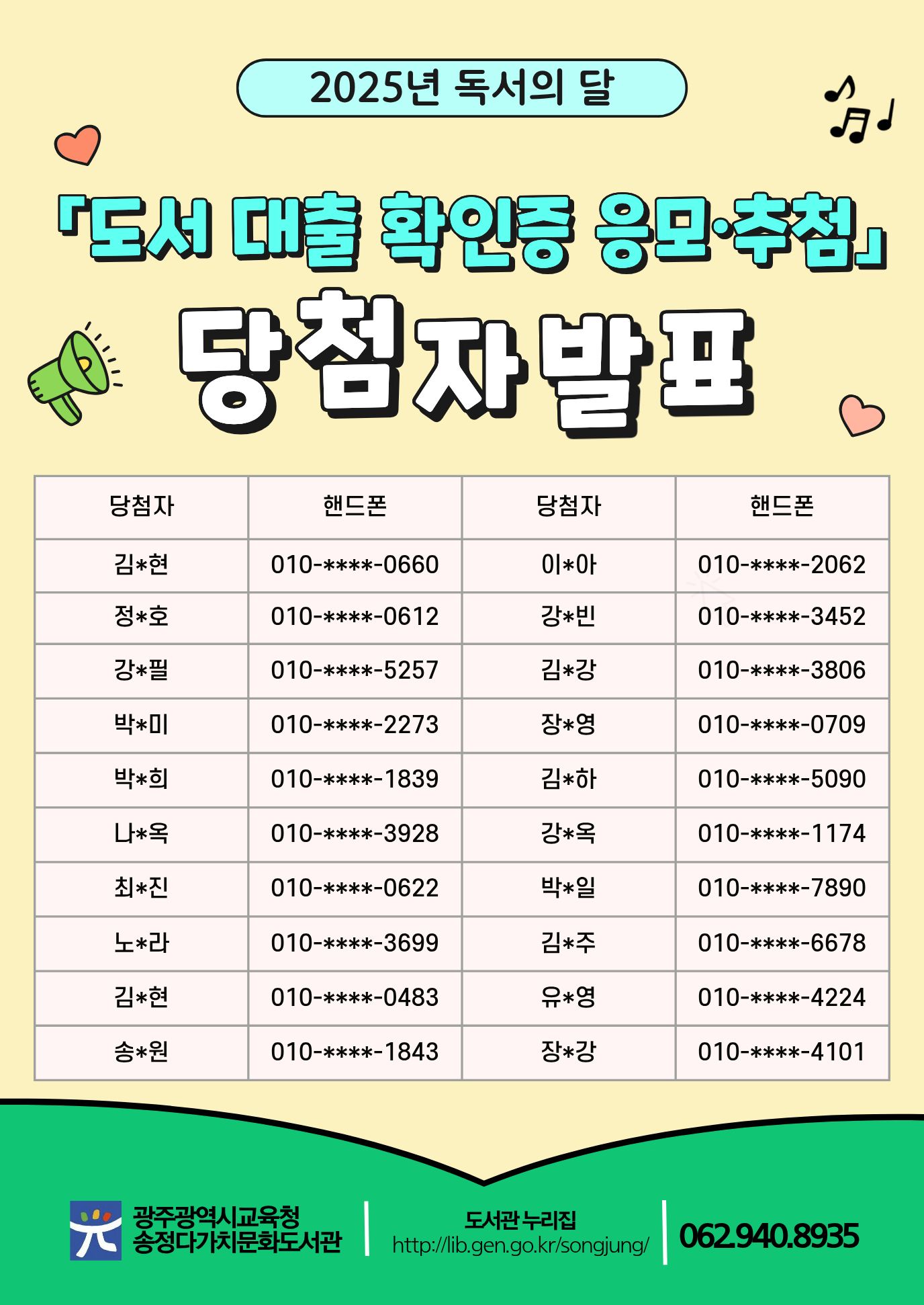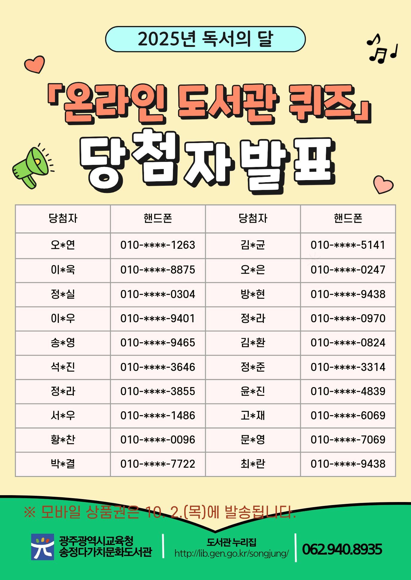 2025년 독서의 달 행사 「온라인 도서관 퀴즈」 및 「도서 대출 확인증 응모·추첨」 당첨자 발표 |